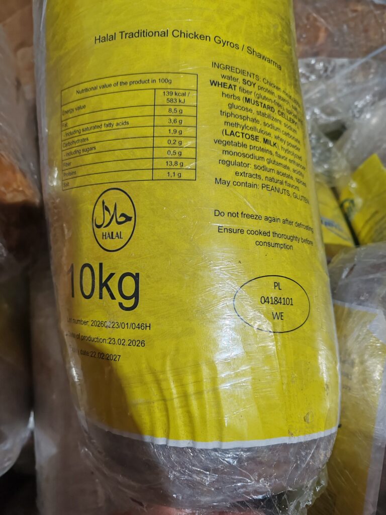 • 1 pallet of raw frozen marinated chicken gyros.