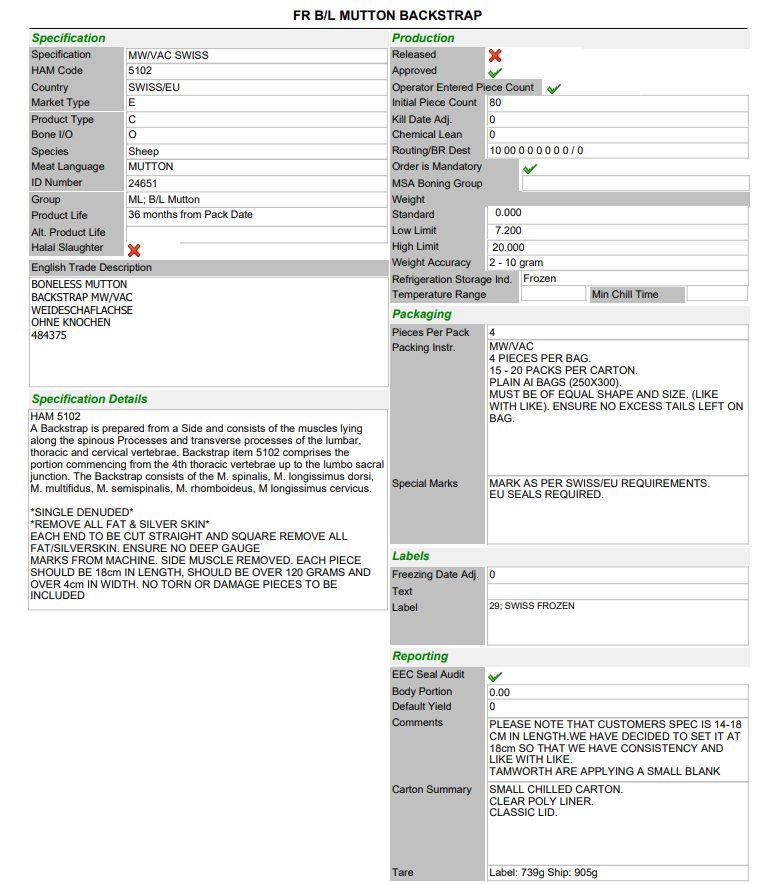 | Packaging: | Variable weight Vac packed -/+ 15kg cartons |
