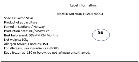 - V-Cut Salmon Heads 400g+, graded by hand, packed into 10kg blast freeze cartons.