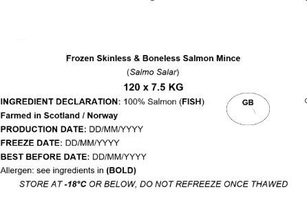 - Frozen Atlantic Salmon Mince, skinless & boneless, packed into 7.5kg compressed blocks